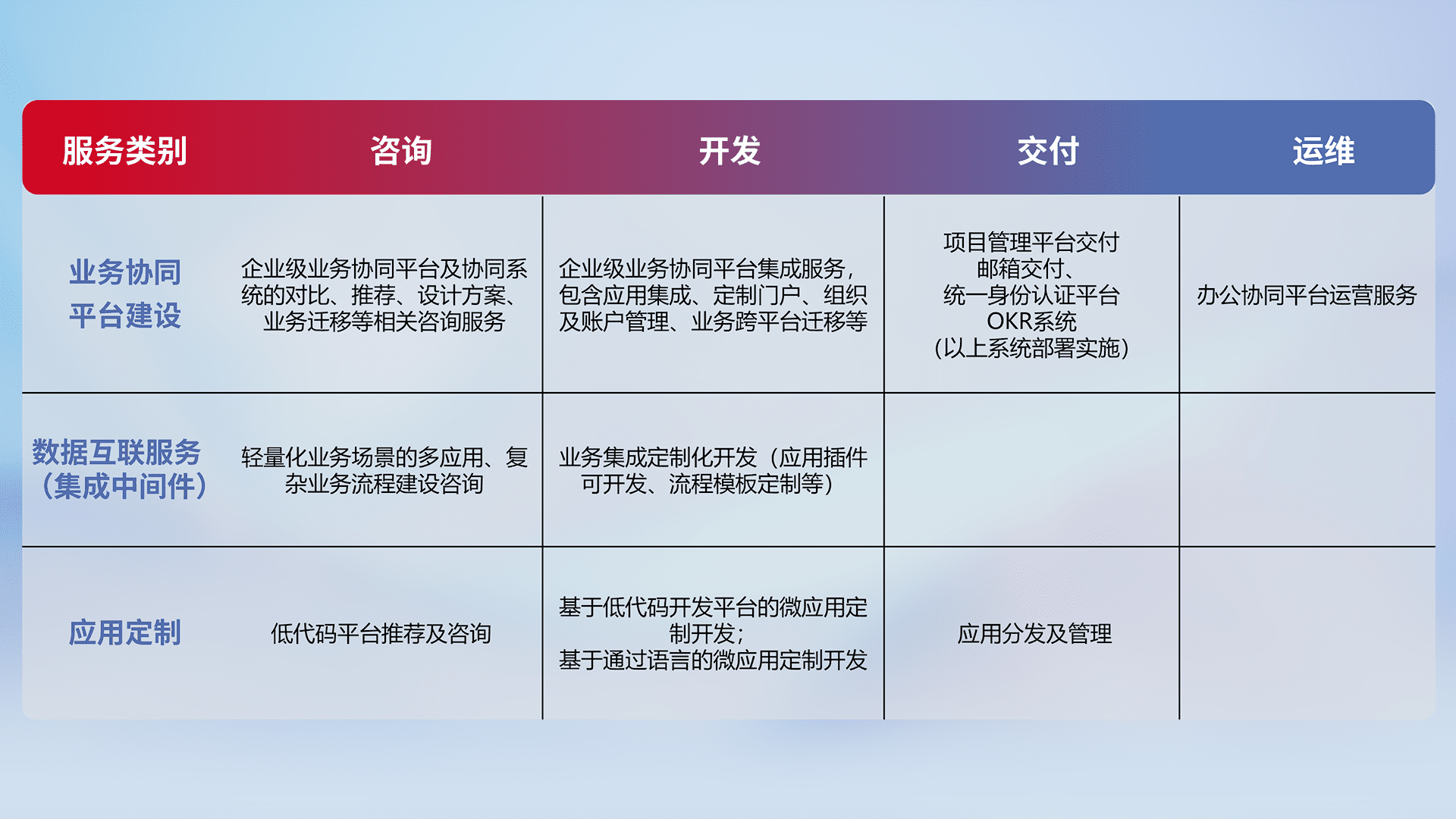 针对钉钉、、、企微、、、IDaas等平台级产品提供产品的规划、、、方案、、、、交付、、、、定制化开发等服务,,,,实现如统一协同办公、、智能客户服务、、、混合会议管理、、智能数据查询、、等业务场景,,,实现数字化转型。。。